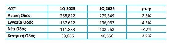 Όσον αφορά τους αυτοκινητόδρομους της Νέας και της Κεντρικής Οδού, η μέση ημερήσια κίνηση για το 2025 παρουσίασε ετήσια μείωση κατά 3,2% και αύξηση 4,9% αντίστοιχα, με τον μέσο ημερήσιο αριθμό διελεύσεων (ADT) διαμορφώνεται σε 108.268 και 40.556 αντίστοιχα.