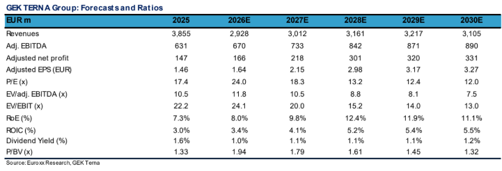 Η τιμή-στόχος συνεπάγεται έναν εύλογο δείκτη EV/EBITDA για το 2026 της τάξης του 6,2x για τις κατασκευές, έναν μεικτό δείκτη 7,7x για την συμβατική ενέργεια και περίπου 11x για το 2028 όσον αφορά τις λειτουργικές παραχωρήσεις.