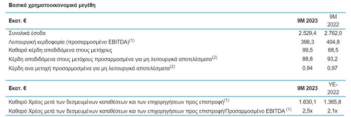 Η λειτουργική κερδοφορία (προσαρμοσμένο EBITDA) διαμορφώθηκε σε € 396,3 εκατ. έναντι € 404,8 εκατ. για το Εννεάμηνο του 2022. Τα καθαρά κέρδη αποδιδόμενα στους μετόχους προσαρμοσμένα για τα μη λειτουργικά αποτελέσματα για το Εννεάμηνο του 2023 διαμορφώθηκαν σε €88,8 εκατ., έναντι € 93,2 εκατ. την αντίστοιχη περίοδο του 2022.
