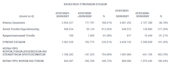 Ο κύκλος εργασιών κατά την τρέχουσα περίοδο σημείωσε αύξηση 188,61% σε σχέση με την αντίστοιχη περσινή περίοδο και οι συνολικές πωλήσεις διαμορφώθηκαν στα 4.081.252 ευρώ. Το αντίστοιχο χρονικό διάστημα του 2020 οι συνολικές πωλήσεις είχαν διαμορφωθεί σε 2.157.389 ευρώ.