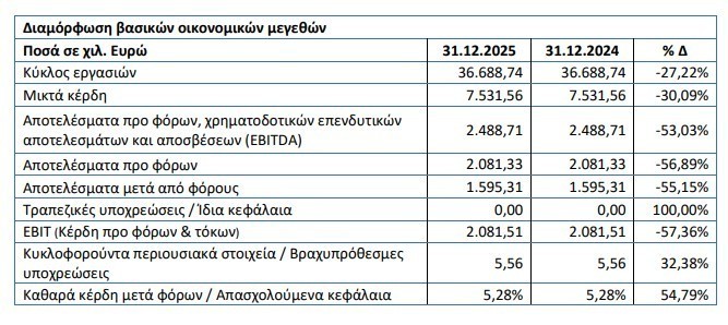 Τα αποτελέσματα μετά από φόρους ανήλθαν σε κέρδη 2.837,48 χιλ. Ευρώ, έναντι κερδών 1.595,31 χιλ. Ευρώ τη χρήση 2024, παρουσιάζοντας αύξηση κατά 77,86%.