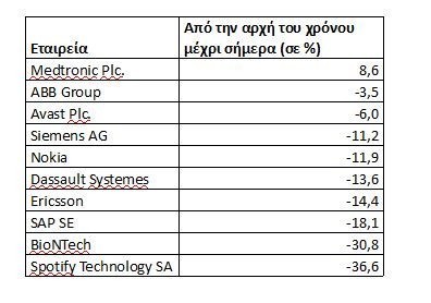 Άλλες εταιρείες όπως η Siemens, η Spotify και η BioNTech σημειώνουν επίσης πτώση. Ίσως η μεγαλύτερη έκπληξη είναι η πτώση της κεφαλαιοποίησης της εταιρείας βιοτεχνολογίας BioNTech, η οποία έχει χάσει πάνω από το 30% της αξίας της από την αρχή του έτους. Μόνο το Spotify τα πήγε χειρότερα, χάνοντας 36,6%. Από την άλλη, μεταξύ αυτών που έχουν υποστεί τις μικρότερες απώλειες είναι ο όμιλος ηλεκτρολογικής μηχανικής ABB (-3,5%) και η εταιρεία λογισμικού Avast (-6%). *