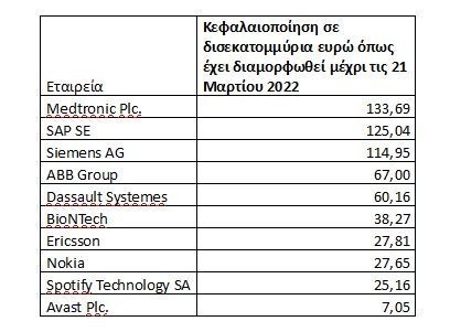 Κεφαλαιοποίηση επιλεγμένων ευρωπαϊκών εταιρειών τεχνολογίας