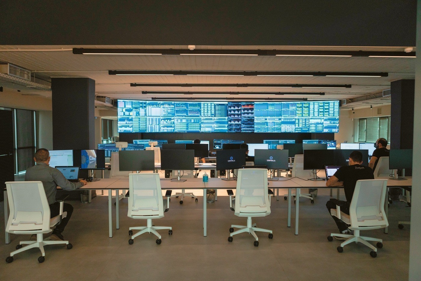 Η αίθουσα θυμίζει θάλαμο πολεμικών επιχειρήσεων! Σαν κι αυτές που βλέπουμε στις ταινίες. Για να εισέλθεις χρειάζεσαι ειδική άδεια και μόνο με ηλεκτρονική ταυτοποίηση. Μπροστά από τα πολλά γραφεία που είναι ενωμένα σε σειρές δεσπόζει ένας μεγάλος τοίχος καλυμμένος ολόκληρος με οθόνες που διαρκώς αναφέρουν την πορεία λειτουργίας των συστημάτων. Για τους «κοινούς θνητούς», όπως εμείς, είναι κάτι… ακαταλαβίστικες γραμμές, γραφήματα, μπάρες, data που «τρέχουν» σε πραγματικό χρόνο! Για τους μηχανικούς κυβερνοασφάλειας, όμως, που έχουν βάρδια στο κέντρο επιχειρήσεων, είναι τα πάντα!