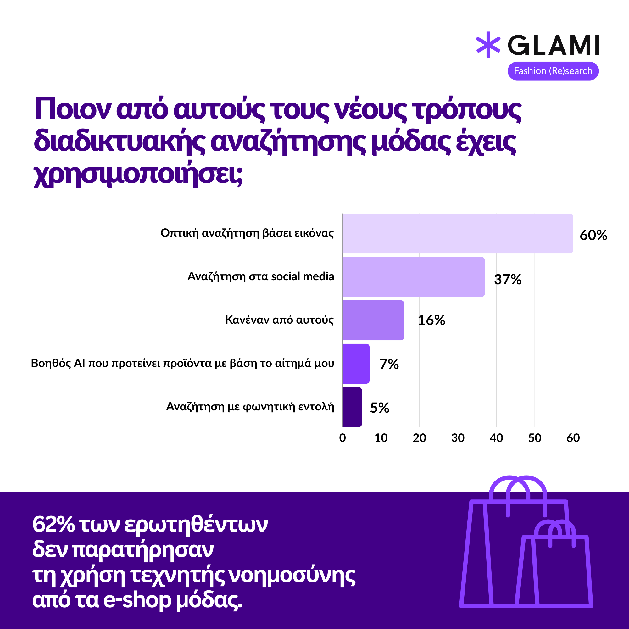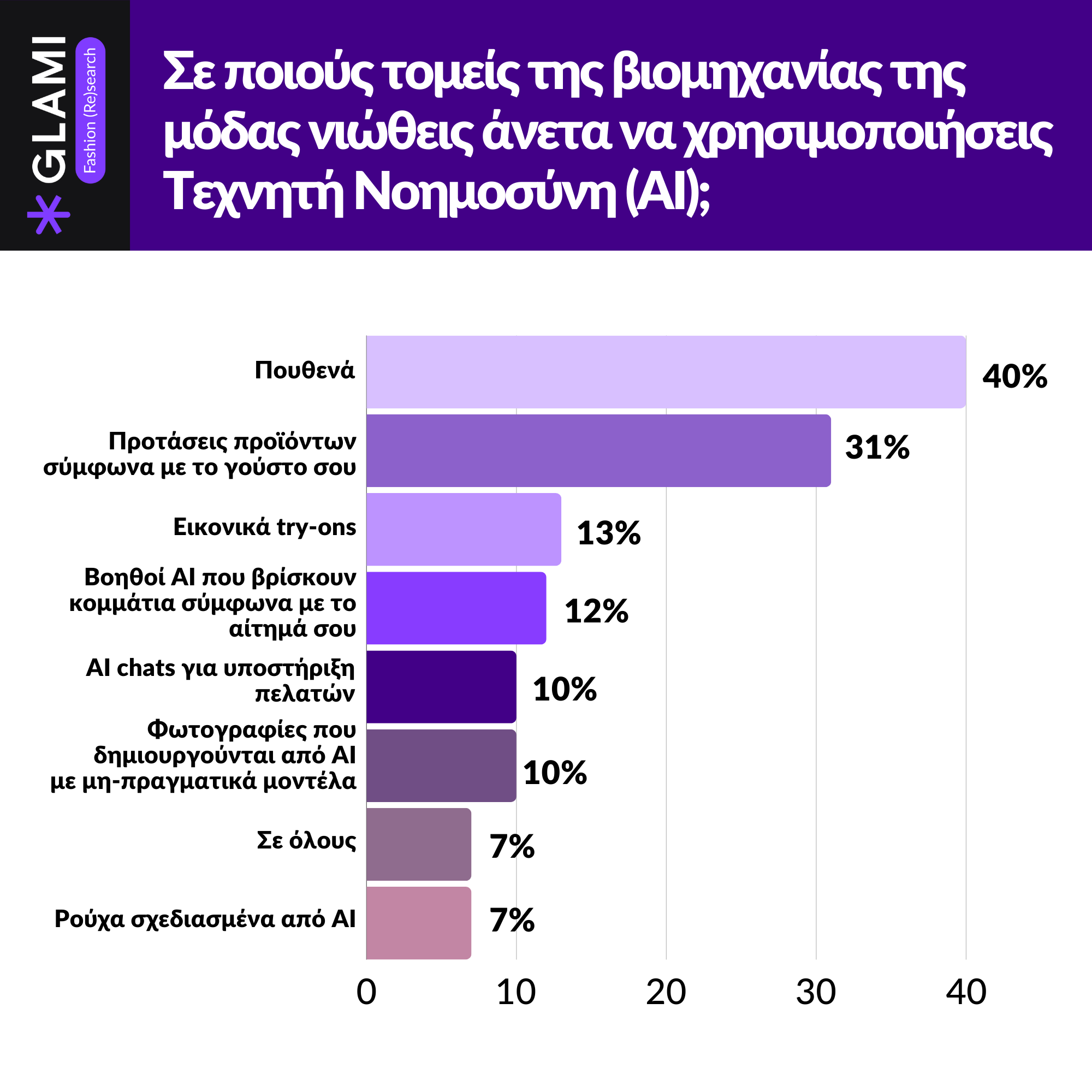 Όσο ο κόσμος του e-commerce αναπτύσσεται ραγδαία και μοιραία συμπορεύεται με την τεχνολογία του ΑΙ, το μεγαλύτερο ποσοστό των Ελλήνων χρηστών φαίνεται να μην είναι ακόμη τόσο εξοικειωμένο με τα εργαλεία Τεχνητής Νοημοσύνης. Το 40% των συμμετεχόντων στην έρευνα Fashion (Re)search από το GLAMI, δήλωσε ότι δεν τρέφει ιδιαίτερο ενδιαφέρον προς τις εταιρείες μόδας που χρησιμοποιούν την τεχνολογία AI – στην πραγματικότητα, ένα ποσοστό 19% δηλώνει προβληματισμένο σχετικά με τη νέα αυτή τάση. Παρόλα αυτά, υπάρχει ένα μεγάλο ποσοστό της τάξης του 25% που φαίνεται θετικό ως προς την εξερεύνηση του νέου ορίζοντα που προσφέρει η Τεχνητή Νοημοσύνη στις αγορές μόδας – γεγονός αναπόφευκτο δεδομένου ότι η τεχνολογία AI χρησιμοποιείται πλέον στους περισσότερους τομείς της σύγχρονης ζωής, ειδικά στο πεδίο του e-commerce και των διαδικτυακών αγορών.
