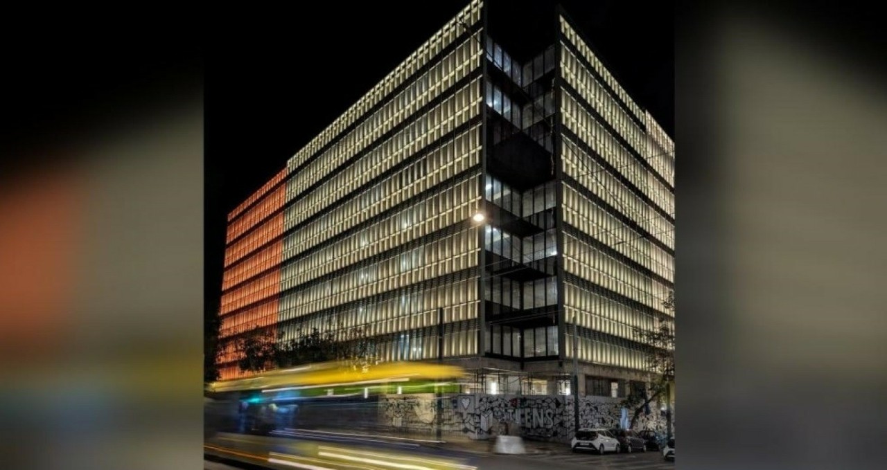 Tα φώτα που έλουσαν το κτήριο ήταν τρία: το ιστορικό πορτοκαλί του εμβληματικού πολυκαταστήματος των περασμένων δεκαετιών, το πράσινο της ελιάς και το λευκό επί της οδού Βερανζέρου.