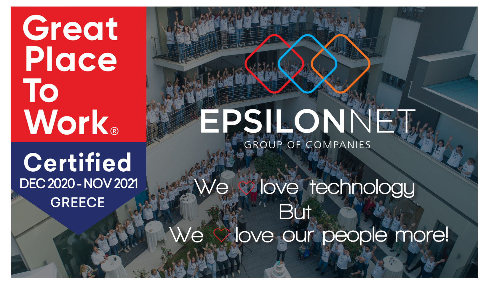 Η Epsilon Net ανακοινώνει ότι απέκτησε την Πιστοποίηση του Great Place to Work®, (CERTIFIED by Great Place to Work®) μετά από μια μεθοδική και διεξοδική αξιολόγηση, η οποία πραγματοποιήθηκε από τον οργανισμό Great Place to Work® Hellas. Η Πιστοποίηση αυτή βασίζεται κατά κύριο λόγο, στην άμεση, ανώνυμη και εμπιστευτική αξιολόγηση την οποία πραγματοποιούν οι εργαζόμενοι της εταιρείας σχετικά με την εμπειρία τους από το εργασιακό τους περιβάλλον.
