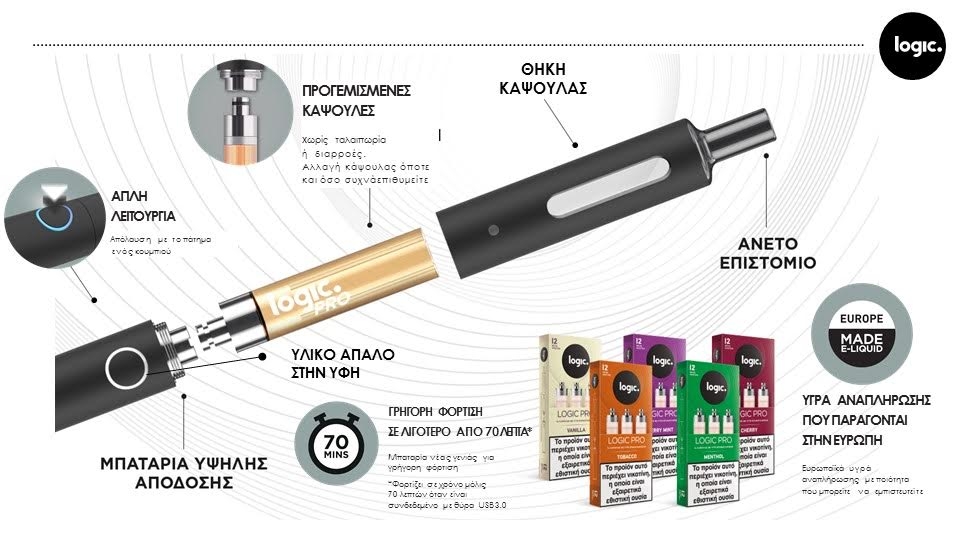 Τι είναι το LOGIC; Πρόκειται για ένα απλό στη χρήση ηλεκτρονικό τσιγάρο υψηλής απόδοσης, που προσφέρει στους καταναλωτές εγγυημένη απόλαυση με τον πιο εύκολο και άνετο τρόπο. Το LOGIC Pro είναι έτοιμο για χρήση αμέσως μετά το άνοιγμα της συσκευασίας. Ο καταναλωτής απλά επιλέγει την κάψουλα και απολαμβάνει τη νέα μοναδική εμπειρία ατμίσματος – είναι τόσο απλό!