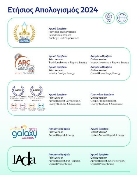 Σημαντικές οι φετινές διακρίσεις σε διεθνείς διαγωνισμούς για τον Ετήσιο Απολογισμό της HELLENiQ ENERGY για το 2024, ο οποίος κατέκτησε 11 βραβεία ως «Καλύτερος Ετήσιος Απολογισμός», καθώς και 8 διακρίσεις.