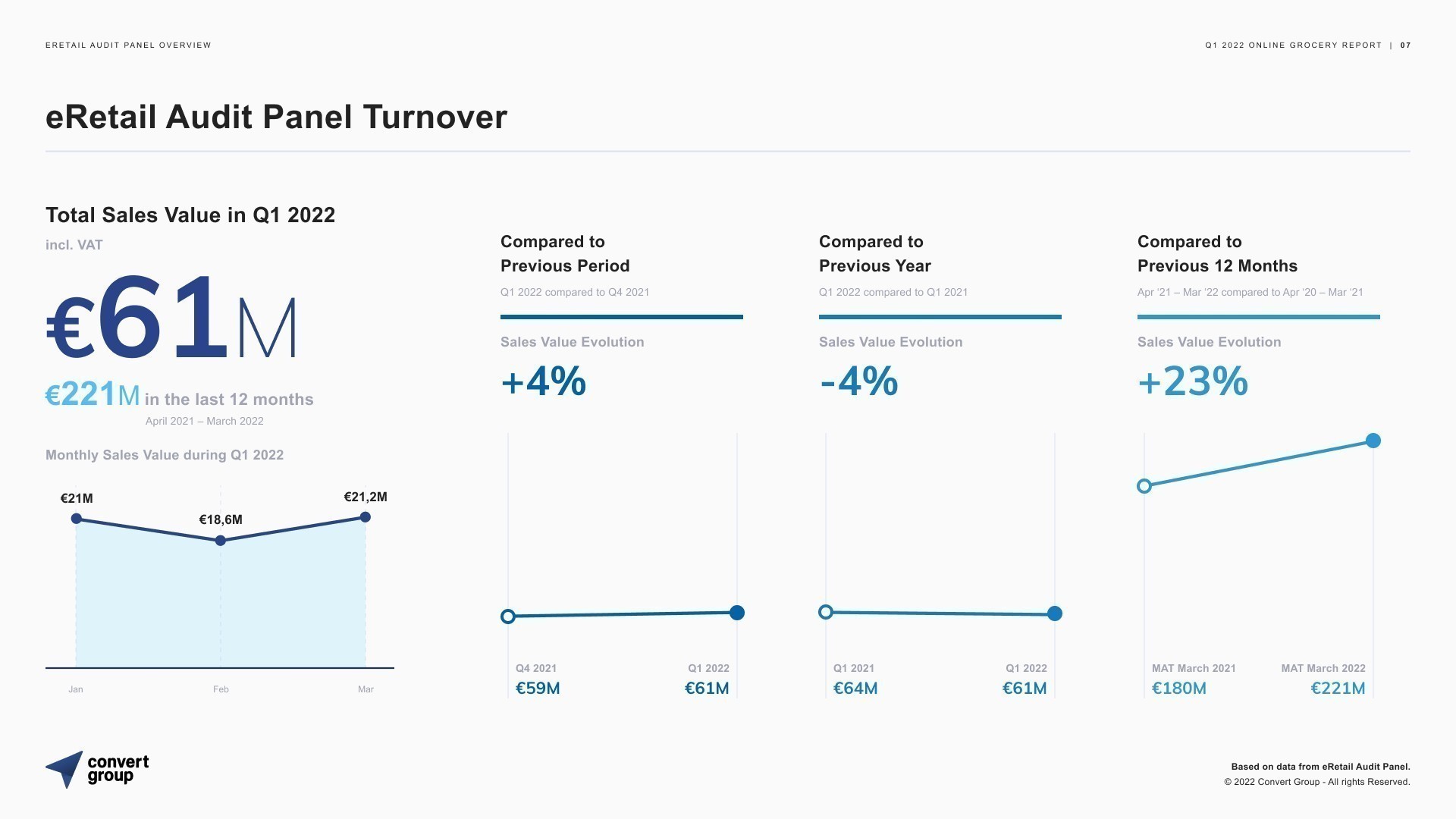 Τα στοιχεία αυτά και πολλά ακόμη πολύτιμα ευρήματα περιλαμβάνονται στο τριμηνιαίο report που δημοσίευσε η Convert Group, η ηγέτιδα εταιρεία στον τομέα των data & analytics για το Ηλ. Εμπόριο Καταναλωτικών Αγαθών και Φαρμάκων, μέσω της πλατφόρμας της eRetail Audit. Η εν λόγω πλατφόρμα δημιουργεί αξία παγκοσμίως σε εκατοντάδες λιανέμπορους και προμηθευτές επιτρέποντας τους την καθημερινή πρόσβαση σε εμπορικά, marketing και τεχνολογικά δεδομένα που διαδραματίζουν καθοριστικό ρόλο στη στρατηγική τους στο ψηφιακό ράφι.