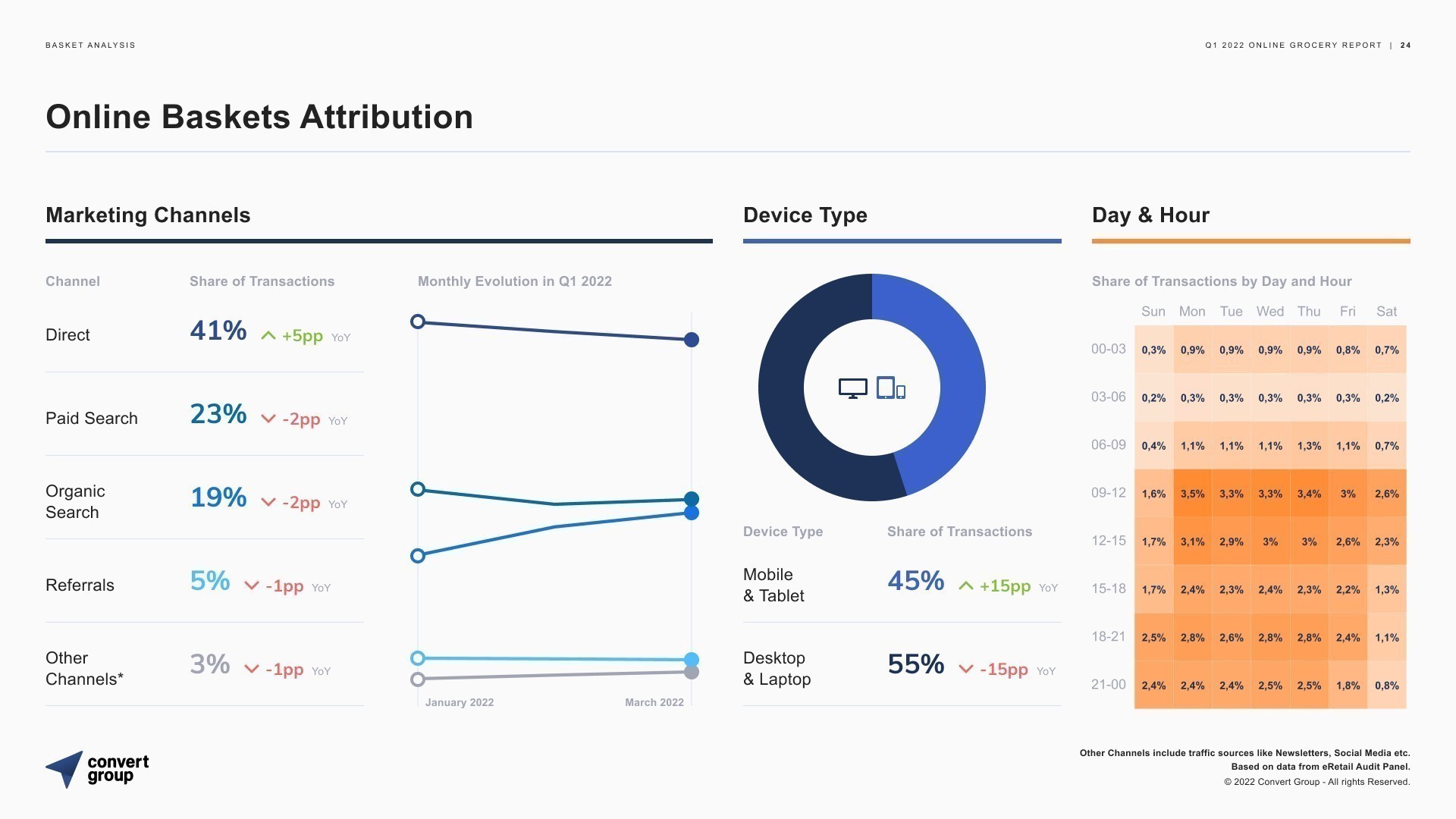Στα marketing κανάλια, σημειώθηκε νέο ρεκόρ με το 41% των παραγγελιών να προέρχονται από direct επισκέψεις στα Online Super Market (δηλαδή οι καταναλωτές πληκτρολογούν απ’ ευθείας την ηλ. διεύθυνση του site ή την έχουν αποθηκεύσει στους σελιδοδείκτες τους), οι οποίες γνωρίζουν μια άνευ προηγούμενου ανάπτυξη, με χαρακτηριστική αύξηση 5 ποσοστιαίων μονάδων συγκριτικά με το πρώτο τρίμηνο του 2021. Από την άλλη πλευρά, σημειώθηκε μια πτώση 2 ποσοστιαίων μονάδων συγκριτικά με το πρώτο τρίμηνο του 2021 στις πωλήσεις που προήλθαν από διαφημίσεις Google (23%) και από οργανικά αποτελέσματα (19%).