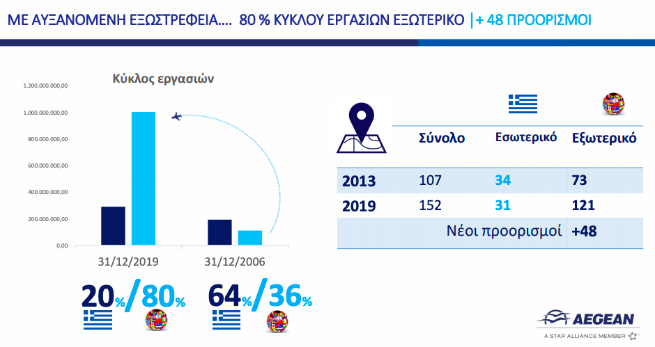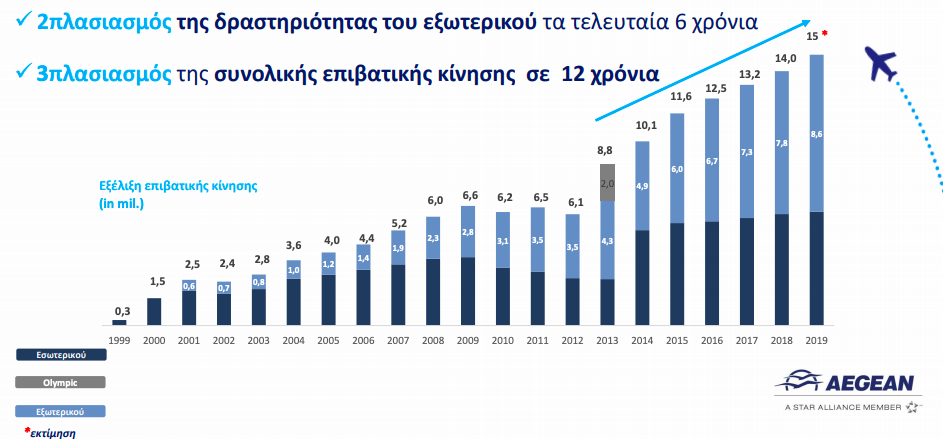 Επισημαίνεται εδώ ότι κατά τη διάρκεια των τελευταίων έξι ετών η δραστηριότητα του εξωτερικού έχει σχεδόν διπλασιαστεί και από τα 4,9 εκατ. της επιβατικής κίνησης που υπολογιζόταν η κίνηση του εξωτερικού στο τέλος του 2014, για τη χρονιά που κλείνει το αντίστοιχο νούμερο υπολογίζεται στα πέριξ των 8,6 εκατ. με συνεχιζόμενη αύξηση από το 2012 και μετά. Με βάση μάλιστα τα στοιχεία του ομίλου για το 2019, ο τζίρος από το δίκτυο εσωτερικού είναι στο 20% όταν μία δεκαπενταετία πρίν, το 2006 το 64% προερχόταν από την Ελλάδα και το 36% από τα δρομολόγια του εξωτερικού.