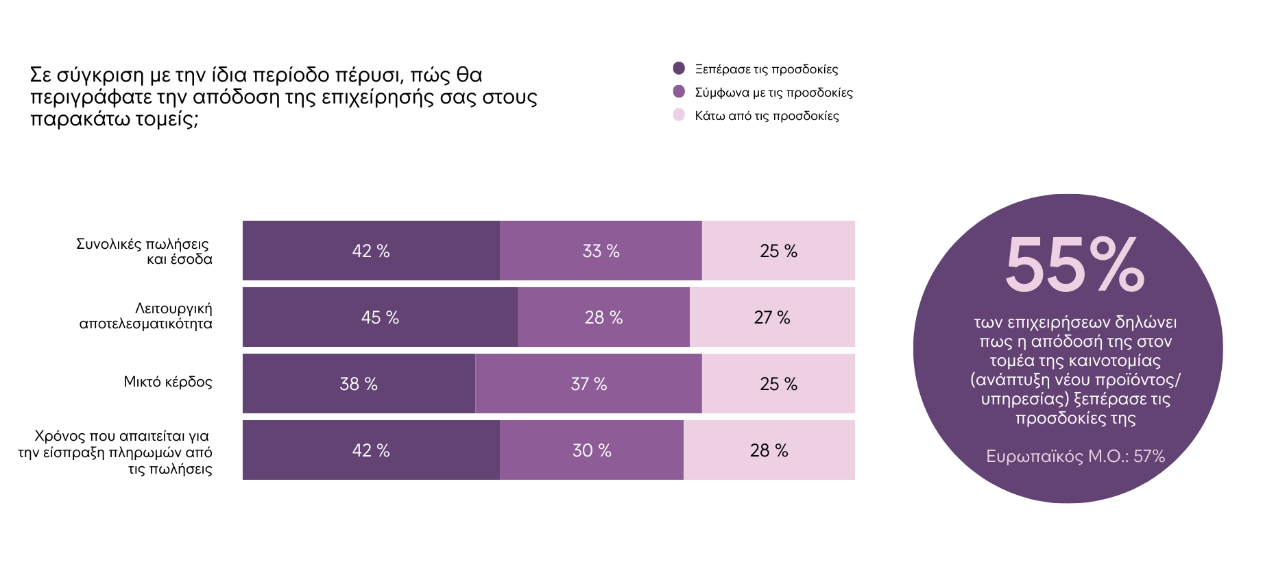 Όπως αποτυπώνεται στο European Payment Report 2025 για την Ελλάδα, οι επιχειρήσεις αναφέρουν ότι η απόδοσή τους στον τομέα της καινοτομίας ξεπέρασε τις προσδοκίες τους σε σχέση με την ίδια περίοδο πέρυσι.