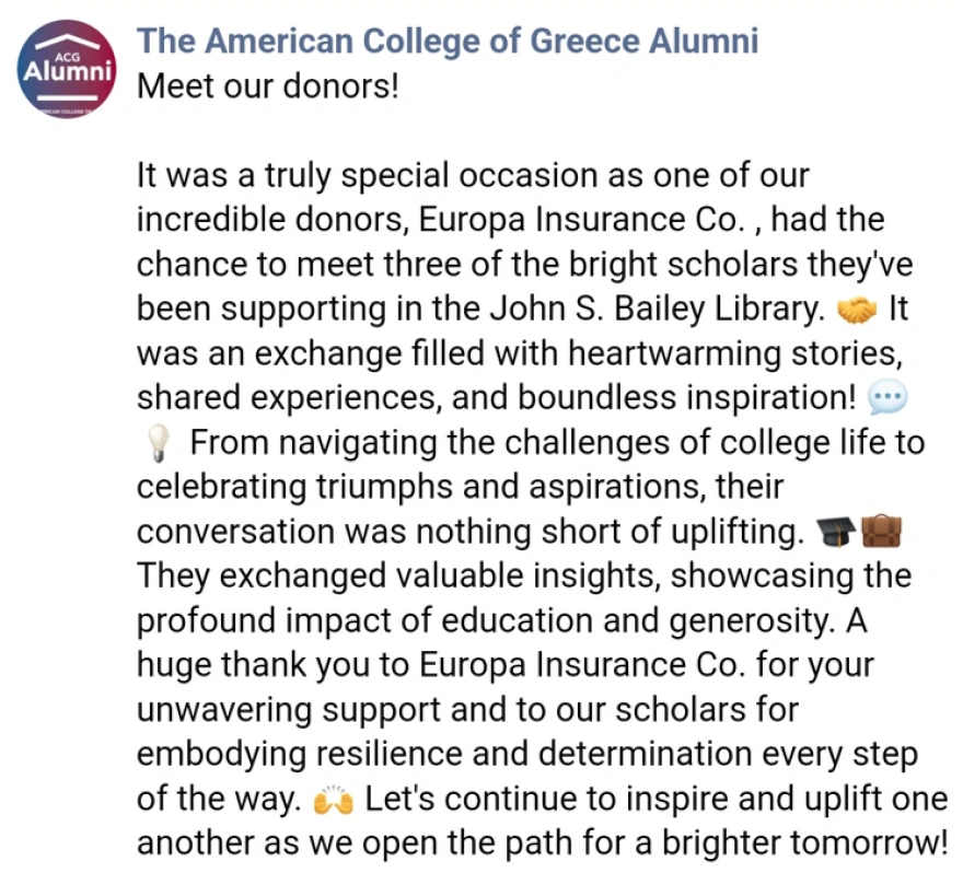 Στην όμορφη εκδήλωση που πραγματοποιήθηκε στους χώρους του Αμερικάνικου Κολλεγίου Ελλάδος στην Αγία Παρασκευή την Τρίτη 3 Απριλίου 2024 ο κ. Νίκος Μακρόπουλος σε μια πραγματικά ξεχωριστή βραδιά είχε την ευκαιρία να γνωρίσει από κοντά τους τρεις από τους πέντε σπουδαστές που υποστηρίζει οικονομικά ως δωρητής των υποτροφιών «John S. Bailey» μέσω του προγράμματος «Europa Insurance Co. Scholarships».