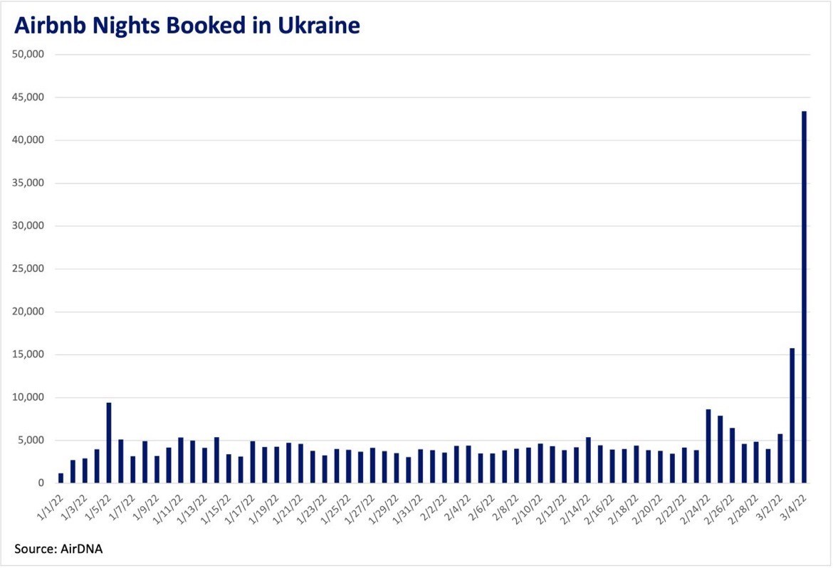 Αυτό επισημαίνει με μήνυμά του στα κοινωνικά δίκτυα ο κ. Τζέιμι Λέιν, αντιπρόεδρος Ερευνας της AirDNA, της εταιρείας που αναλύει τα δεδομένα των βραχυχρόνιων μισθώσεων σε διεθνές επίπεδο. Η εταιρεία παρουσιάζει αναλυτικά τις «εικονικές» κρατήσεις που έχουν γίνει από τις αρχές του έτους στην Ουκρανία, πριν ακόμη τη ρωσική εισβολή της Ρωσίας και όπως προκύπτει, καθ’ όλη τη διάρκεια του Ιανουαρίου και του Φεβρουαρίου οι κρατήσεις ήταν μεταξύ 2.000- 5.000 ημερησίως (πλην τις 5ης Ιανουαρίου που έφθασε λίγο κάτω από τις 10.000), ενώ ελαφριά άνοδος καταγράφηκε μετά τη ρωσική εισβολή. Εντυπωσιακή ωστόσο είναι η ‘’έκρηξη’’ το διήμερο 2- 3 Μαρτίου- όσο γίνεται πιο έντονο το διεθνές κίνημα συμπαράστασης από πολίτες σε όλο τον κόσμο που σπεύδουν να κάνουν κρατήσεις σε πόλεις της Ουκρανίας όπως το Κίεβο, το Χάρκοβο, την Μαριούπολη κ.α. ώστε να στηρίξουν τους Ουκρανούς που δοκιμάζονται με τον πιο σκληρό τρόπο: