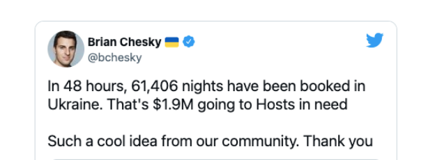 «Είναι απίστευτο να παρατηρεί κανείς το πώς διαχέεται η συμπαράσταση στους Ουκρανούς. Kαταγράψαμε πάνω από 60.000 διανυκτερεύσεις στην Airbnb, με ένα σύνολο εσόδων 2 εκατομμυρίων δολαρίων το τελευταίο διήμερο 2- 3 Μαρτίου».
