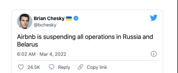 H μεγαλύτερη πλατφόρμα βραχυχρόνιας μίσθωσης έχει ανακοινώσει επίσης μέσω του συνιδρυτή και CEO κ. Μπράιαν Τσέσκι στις 4 Μαρτίου την απόφασή της να αναστείλει τις δραστηριότητές της σε Ρωσία και Λευκορωσία «μπλοκάροντας» τους οικοδεσπότες σε αυτές τις χώρες να δέχονται νέες κρατήσεις.