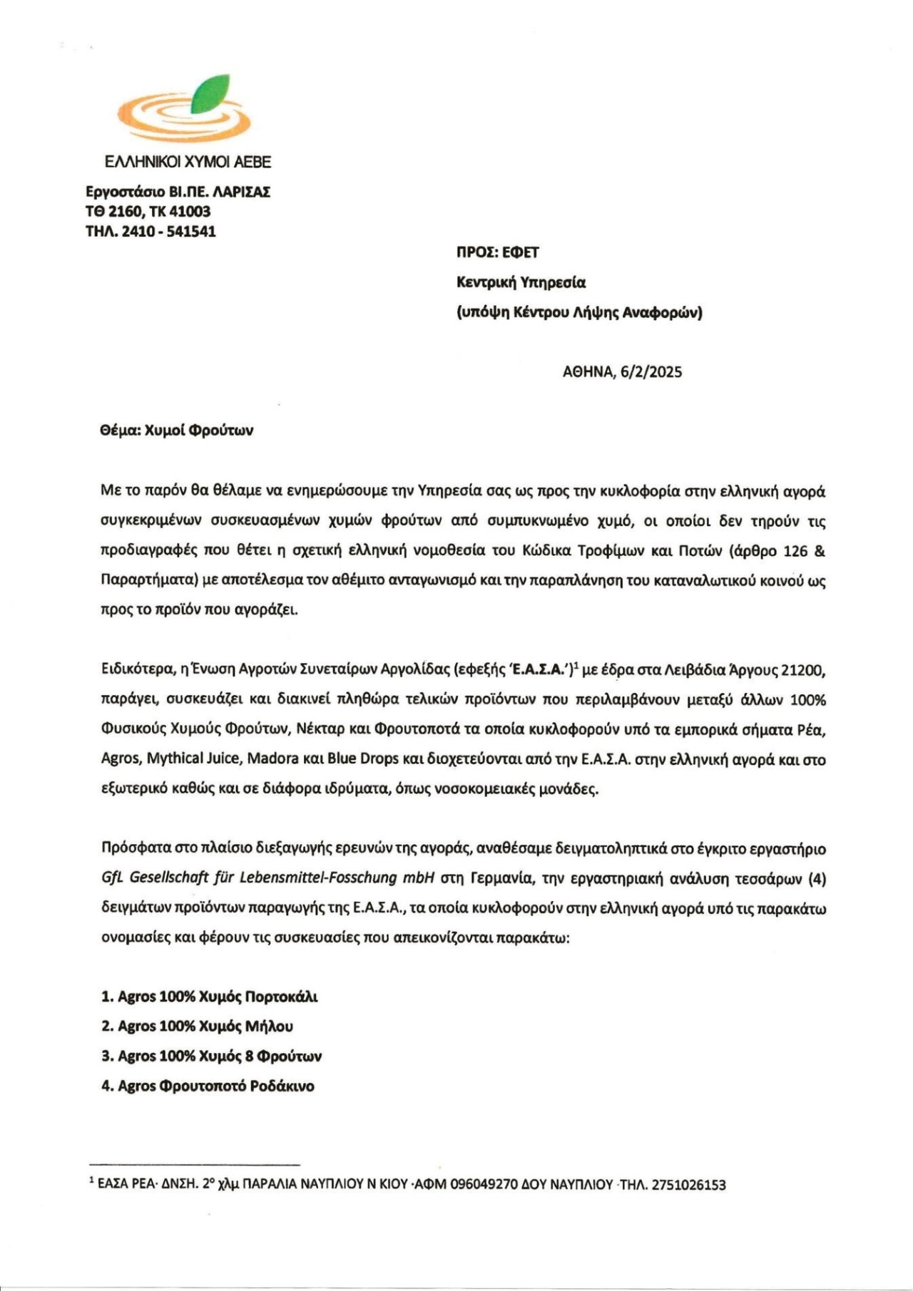 Στην επίσημη καταγγελία που κατέθεσε η Ελληνικοί Χυμοί ΑΕΒΕ προς τον ΕΦΕΤ στις 6 Φεβρουαρίου 2025 και την οποία υπογράφουν ο πρόεδρος της εταιρείας Σπύρος Θεοδωρόπουλος και ο διευθύνων σύμβουλος Δημήτρης Κορκοντζέλος, γίνεται αναλυτική και ονομαστική αναφορά σε τέσσερα προϊόντα της Ενωσης Αγροτών Συνεταίρων Αργολίδας, τα οποία, όπως αναφέρεται, εξετάστηκαν εργαστηριακά από το ανεξάρτητο εργαστήριο GfL Gesellschaft für Lebensmittel-Forschung mbH του Βερολίνου, στο πλαίσιο έρευνας αγοράς που προηγήθηκε της προσφυγής στην αρμόδια αρχή.