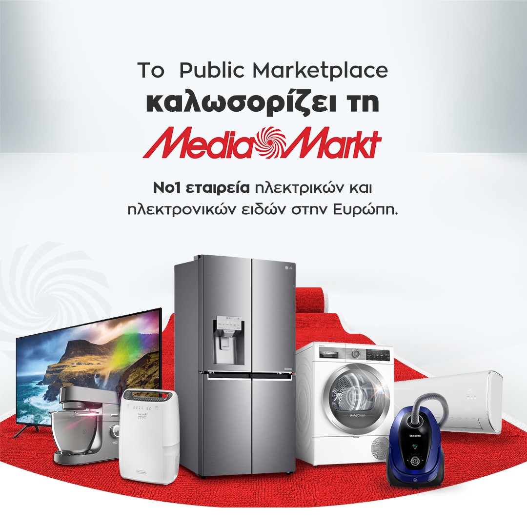 Το Public Marketplace καλωσορίζει τη MediaMarkt, τη μεγαλύτερη αλυσίδα ηλεκτρικών και ηλεκτρονικών συσκευών στην Ευρώπη. Το portfolio του Public Marketplace ενισχύεται με τη νέα κατηγορία των μεγάλων οικιακών συσκευών (ψυγείο, πλυντήριο, κουζίνες, τηλεοράσεις κ.ά.), ενώ αυτή των οικιακών μικροσυσκευών (συσκευές μαγειρικής, προσωπικής φροντίδας, κλιματισμός & Θέρμανση κα.) εμπλουτίζεται σημαντικά. Όλες οι κορυφαίες, επώνυμες μάρκες, στις πιο ανταγωνιστικές τιμές και πάντα με την εξυπηρέτηση που χαρακτηρίζει τόσο το Public όσο και τη MediaMarkt.
