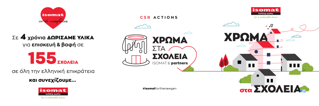Η ISOMAT, στο πλαίσιο του ολοκληρωμένου προγράμματος Εταιρικής Κοινωνικής Ευθύνης «ISOMAT από καρδιάς» και της επιμέρους δράσης για τη στήριξη της νέας γενιάς «ISOMAT FOR THE NEW GEN», επεκτείνει την ενέργεια «Χρώμα στα Σχολεία» σε «Χρώμα στα Σχολεία– ISOMAT & Partners», εμπλέκοντας πλέον σε αυτήν και τους συνεργάτες της από το δίκτυο καταστημάτων πώλησης των προϊόντων της.