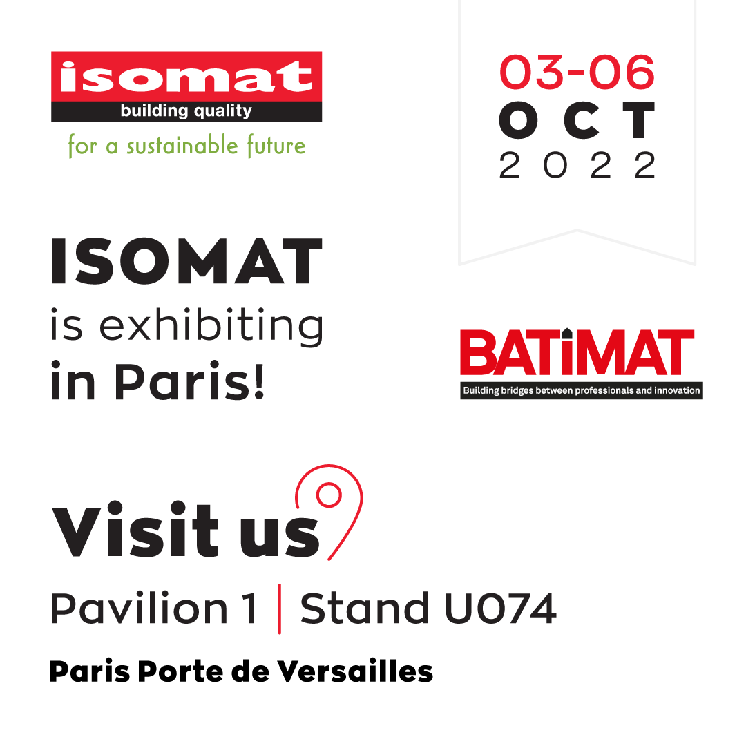Η ISOMAT, συμμετέχει στην BATIMAT 2022, τη μεγαλύτερη διεθνή έκθεση στη Γαλλία για τον κατασκευαστικό κλάδο, η οποία λαμβάνει χώρα στο Παρίσι από τις 3 έως τις 6 Οκτωβρίου, στο εκθεσιακό κέντρο Paris Porte de Versailles.