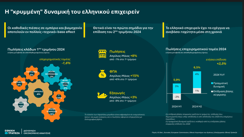 Αναλυτικότερα, οι επιχειρηματικές πωλήσεις κατά το 1ο τρίμηνο του 2024 κατέγραψαν ετήσια μείωση 1,6% σε αποπληθωρισμένους όρους. Ωστόσο, στην πραγματικότητα, η αρνητική επίδραση της βάσης σύγκρισης με το υψηλής μεταβλητότητας έτος 2023 (base effect της τάξης των 5 ποσοστιαίων μονάδων) «έκρυψε» πλήρως την πραγματική θετική δυναμική των πωλήσεων του επιχειρηματικού τομέα κατά την εκκίνηση του έτους (+3,0% σε αποπληθωρισμένους όρους). Αυτή η αξιοθαύμαστη (εν μέσω διεθνούς περιβάλλοντος αβεβαιότητας) ανθεκτικότητα του επιχειρηματικού τομέα επιβεβαιώνεται από (i) τη συνεχή άνοδο του μεριδίου της Ελλάδας στο ευρωπαϊκό επιχειρείν (1,14% σε όρους αποπληθωρισμένης προστιθέμενης αξίας, έναντι 1,08% προ διετίας), και (ii) το ρεκόρ απασχόλησης, με τις καθαρές προσλήψεις του πενταμήνου Ιανουάριος-Μάιος (+315 χιλ.) να βρίσκονται στο υψηλότερο σημείο από το 2001.