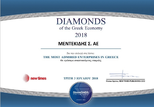 Μια σημαντική διάκριση έλαβε η εταιρεία Σ. ΜΕΝΤΕΚΙΔΗΣ Α.Ε., βιομηχανία εμφιάλωσης των Φυσικών Μεταλλικών Νερών ΔΙΟΣ και ΣΕΛΙ καθώς βραβεύτηκε ως ένα από τα Διαμάντια της Ελληνικής Οικονομίας για το 2018 για την εξαιρετική επιχειρηματική πορεία της.
