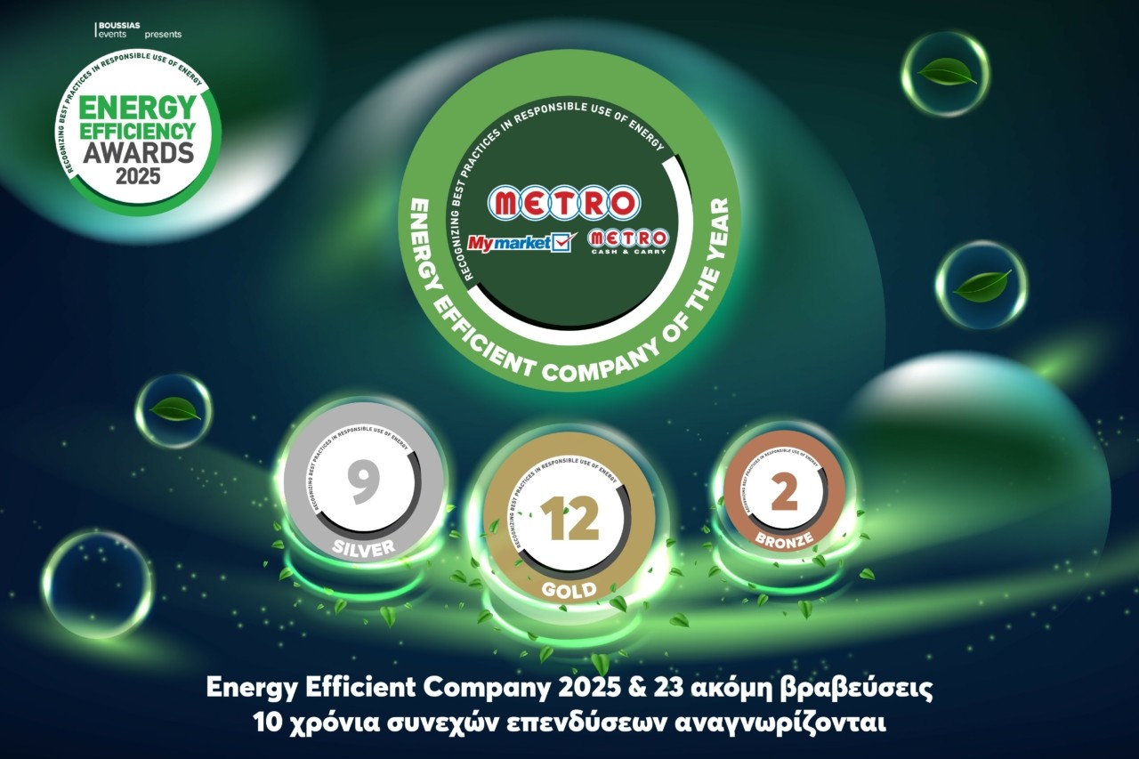 Η METRO (My market και METRO Cash & Carry) διακρίθηκε με 23 βραβεία στα Energy Efficiency Awards 2025, κατακτώντας την κορυφαία διάκριση του θεσμού, Energy Efficient Company of the Year.
