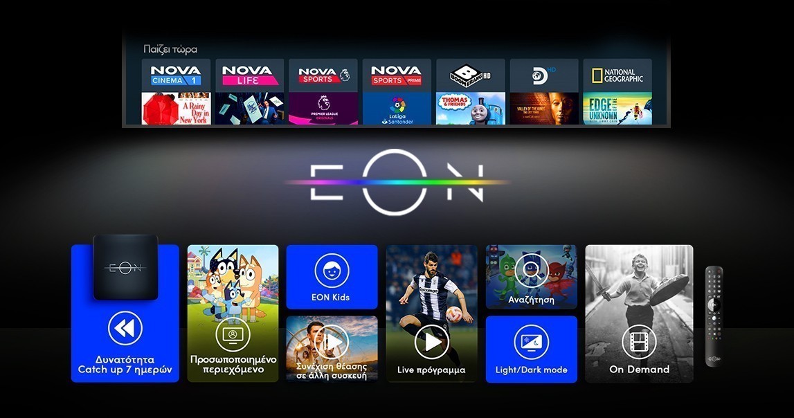 H EON είναι μία ολοκληρωμένη λύση που συνδυάζει πληρότητα περιεχομένου, premium ποιότητα και απλότητα στην χρήση. Με μια πλειάδα λειτουργιών που διευκολύνουν την εμπειρία του συνδρομητή, η ΕΟΝ προσφέρει πλήρη οδηγό προγράμματος, μηχανή προσωποποιημένων προτάσεων περιεχομένου, βραβευμένο τηλεκοντρόλ, δημιουργία προφίλ, φωνητική υποστήριξη και On Demand κατάλογο με δυνατότητα έξυπνης αναζήτησης. Παράλληλα, ο συνδρομητής της ΕΟΝ μέσω του Catch up 7 ημερών μπορεί να παρακολουθήσει τηλεοπτικά προγράμματα έως και 7 ημέρες μετά τη μετάδοσή τους, να ξεκινήσει από την αρχή ή να γυρίσει προς τα πίσω ένα πρόγραμμα, να διακόψει και να συνεχίσει την παρακολούθηση ενός προγράμματος αργότερα. Τα παιδιά έχουν τον δικό τους ασφαλή χώρο διασκέδασης, με το EON kids.