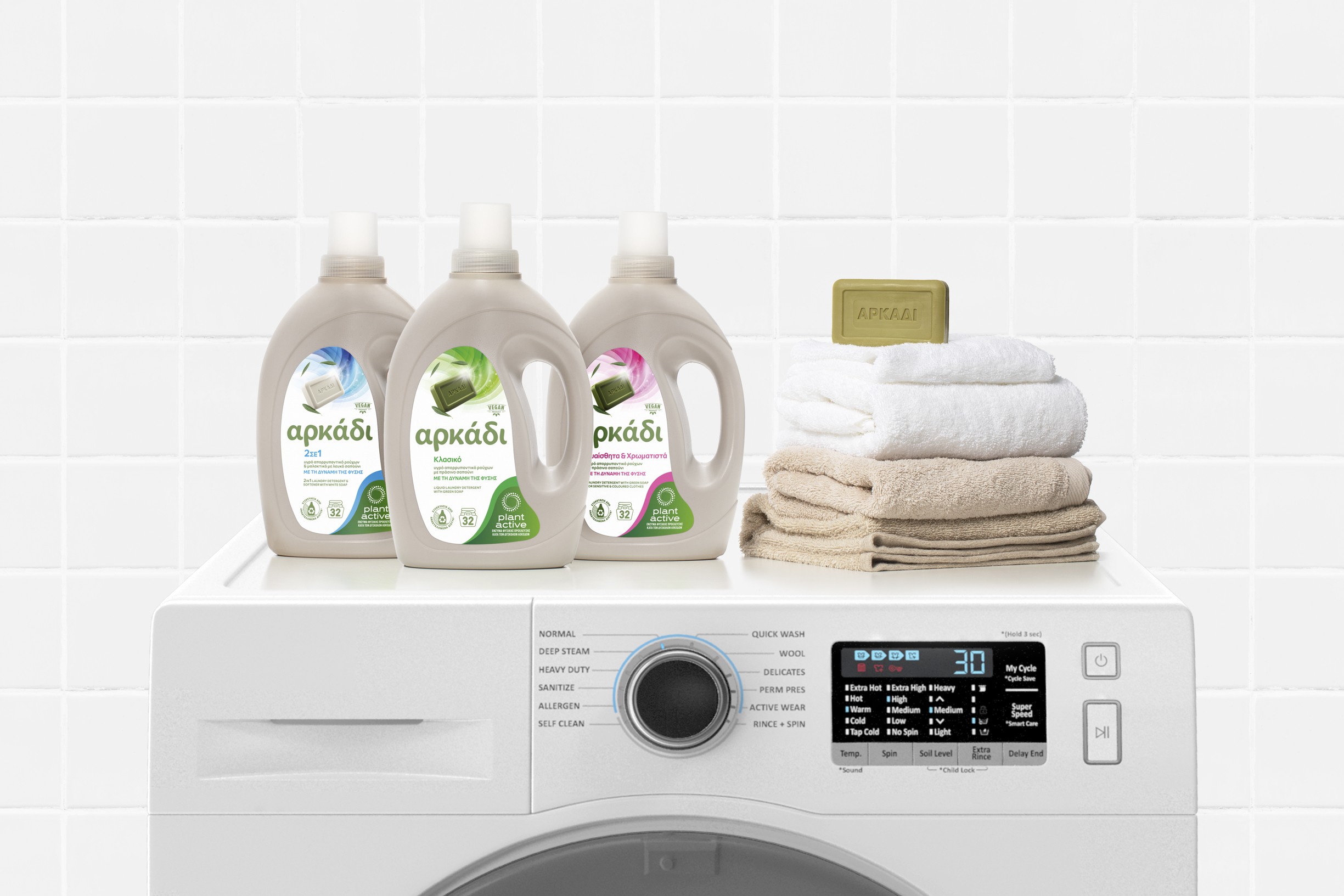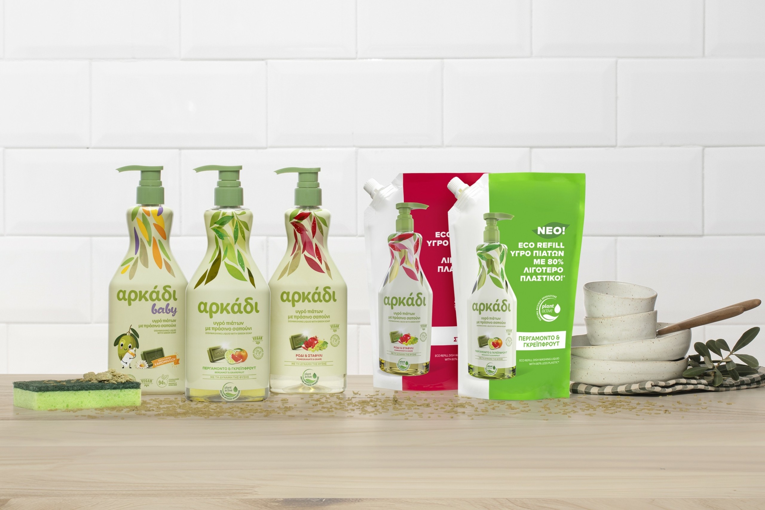 Οι νέες σειρές είναι αποδεδειγμένα αποτελεσματικές, ακόμη και σε σύγκριση με τα κορυφαία προϊόντα στην κατηγορία τους και έχουν σχεδιαστεί με γνώμονα τη μείωση του περιβαλλοντικού αποτυπώματος: η συσκευασία των απορρυπαντικών προέρχεται από ανακυκλωμένα γεωργικά δίχτυα, κατά 30% κατ’ ελάχιστο, ενώ τα υγρά πιάτων έρχονται σε πρακτικές επαναγεμιζόμενες αντλίες, οι οποίες συνοδεύονται από ανταλλακτικά σακουλάκια με 80% λιγότερο πλαστικό (σε σχέση με την αντλία Αρκάδι υγρών πιάτων) – μία μεγάλη καινοτομία για την κατηγορία.