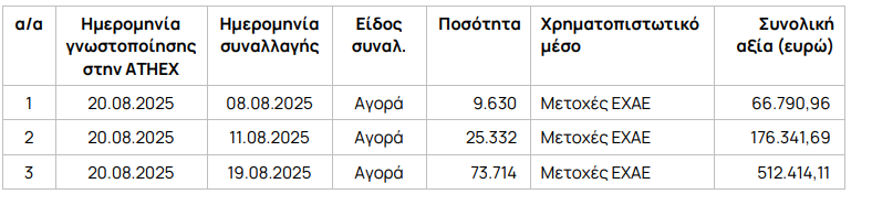 Επιπροσθέτως, η PRAUDE ASSET MANAGEMENT LIMITED με γραπτή γνωστοποίηση προς την Εταιρεία στις 20.08.2025 ενημέρωσε ότι προέβη στις ακόλουθες συναλλαγές μετοχών της Εταιρείας: