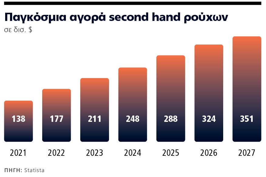 Η άνοδος των μεταχειρισμένων προϊόντων βέβαια αποτελεί παγκόσμια τάση. Σύμφωνα με τη Statista, η αποτίμηση μόνο της αγοράς second hand ρούχων το 2022 ήταν 177 δισ. δολάρια, με προοπτική μάλιστα ως το 2027 να φτάσει τα 351 δισ. δολάρια!