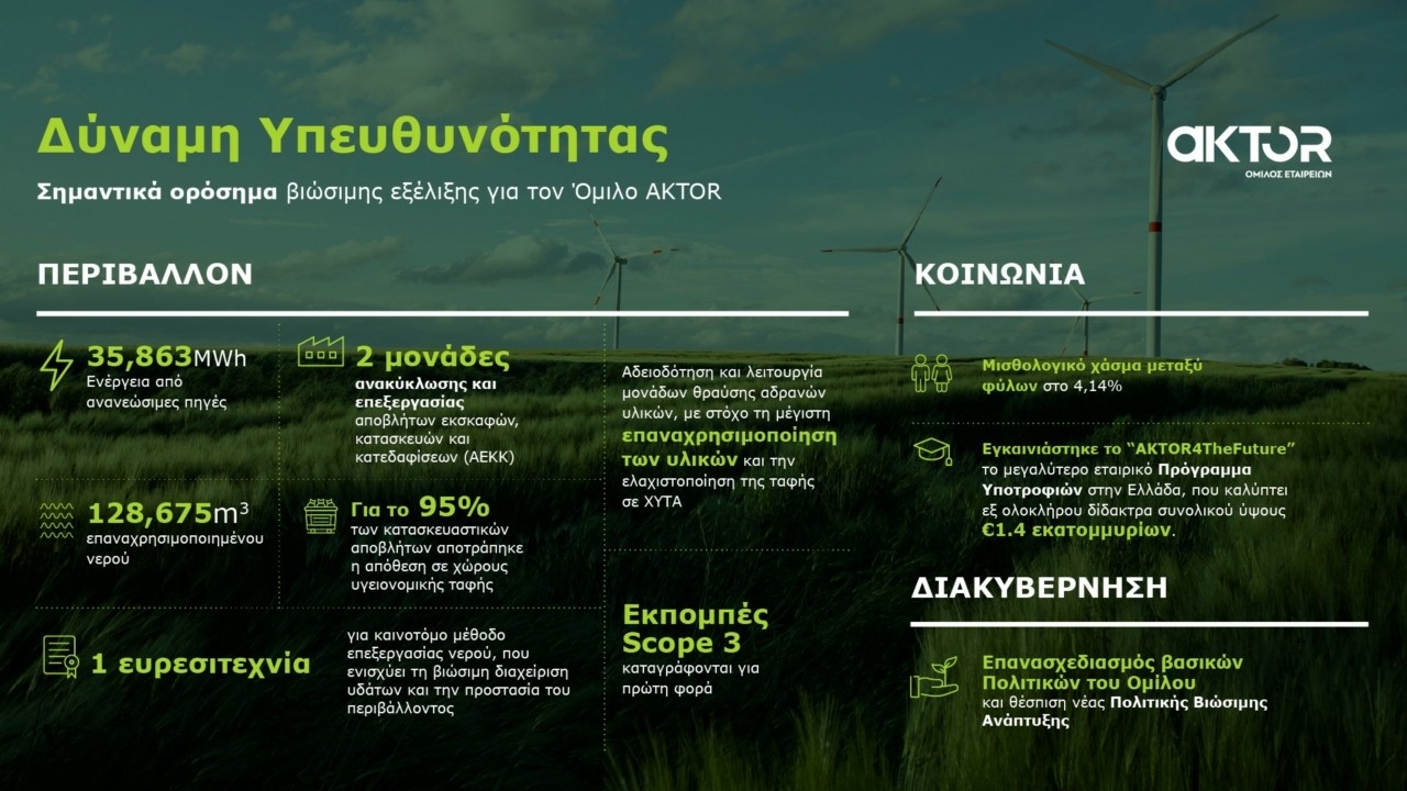 Την στρατηγική του αυτή τοποθέτηση επιβεβαιώνει η Έκθεση Βιωσιμότητας του Ομίλου AKTOR για το οικονομικό έτος 2024, η οποία είναι η πρώτη στην ιστορία του Ομίλου που είναι πλήρως εναρμονισμένη με τις ευρωπαϊκές οδηγίες CSRD και τα πρότυπα ESRS και, μάλιστα, ενσωματώνει την ΑΚΤΩΡ ΑΤΕ, την οποία εξαγόρασε στα τέλη του 2023.