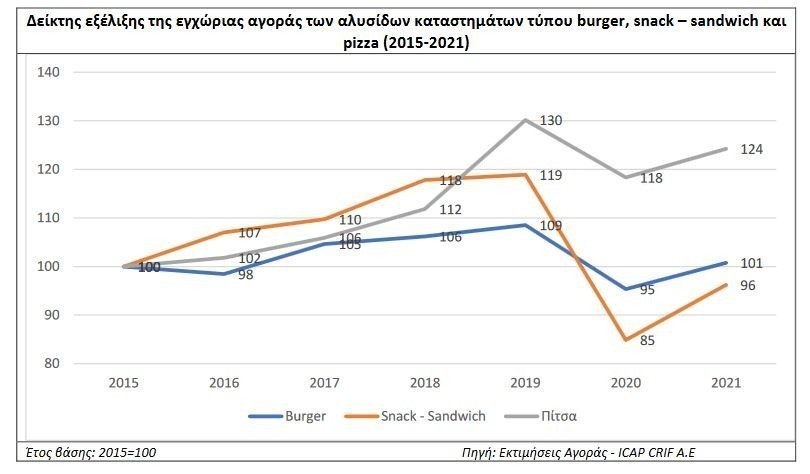 Ειδικότερα, η κατηγορία των καταστημάτων snack-sandwich εκτιμάται ότι κατέγραψε αύξηση πωλήσεων με ρυθμό περίπου 13,5% το 2021/2020, οι αλυσίδες τύπου burger ενισχύθηκαν κατά 6%, ενώ αύξηση σε ποσοστό 5% περίπου εκτιμάται ότι παρουσίασαν οι αλυσίδες καταστημάτων pizza. Θετική ήταν η μεταβολή των πωλήσεων και στις λοιπές κατηγορίες καταστημάτων (σουβλάκι κ.λπ.).
