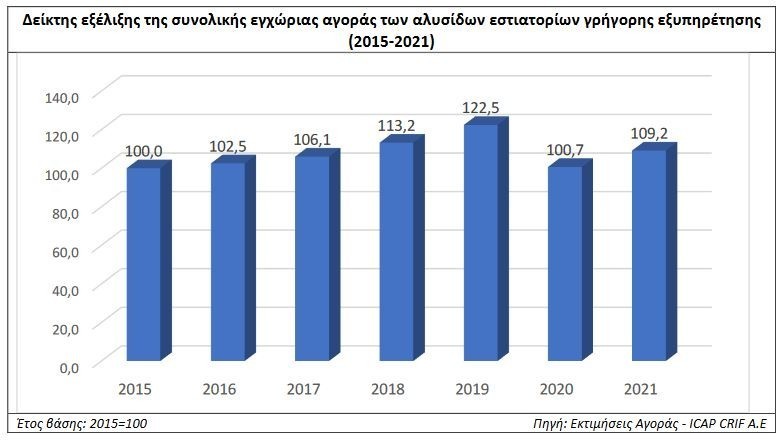 H Σταματίνα Παντελαίου, Διευθύντρια Οικονομικών & Κλαδικών Μελετών της ICAP CRIF επισημαίνει ότι η εγχώρια αγορά εστίασης μέσω των οργανωμένων αλυσίδων καταστημάτων γρήγορης εξυπηρέτησης (συνολικές πωλήσεις αυτών) παρουσίασε ανοδική πορεία την περίοδο 2016-2019 με μέσο ετήσιο ρυθμό 5,2%. Η μεταβολή αυτή ήταν αποτέλεσμα της αυξημένης ζήτησης, της επέκτασης του δικτύου καταστημάτων ορισμένων αλυσίδων αλλά και της εισόδου νέων αλυσίδων στον κλάδο.