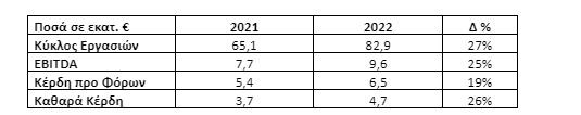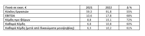 - Ο Κύκλος Εργασιών ανήλθε στα € 91,8 εκατ. και σημείωσε αύξηση κατά 55% σε σύγκριση με το 2021. Η άνοδος προήλθε από την αύξηση του όγκου σε συνδυασμό με την υψηλότερη τιμή διάθεσης που συνδέεται με την τιμή της πρώτης ύλης.