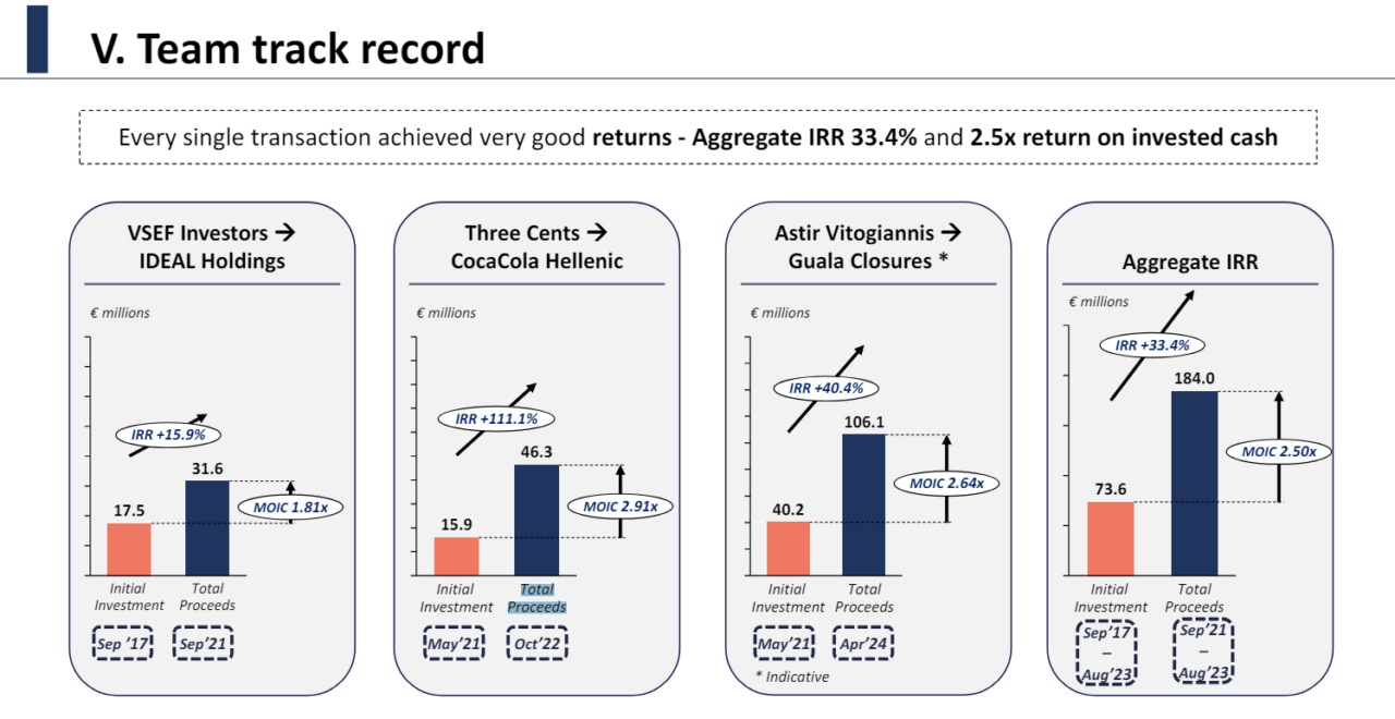 Γενικότερα, κάθε συναλλαγή είχε πολύ καλές αποδόσεις, με συνολικό IRR 33,4% και 2.5x απόδοση σε μετρητά που επενδύθηκαν.