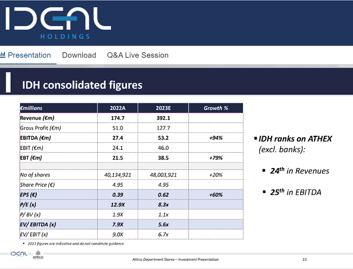 Παράλληλα, μετά την ολοκλήρωση της συναλλαγής, η εισηγμένη θα έχει τις προοπτικές να ανέλθει στην 24η θέση σε επίπεδο εσόδων και 25η στα EBITDA (IDH ranks on ATHEX), προσβλέποντας σε υψηλότερη αποτίμηση.