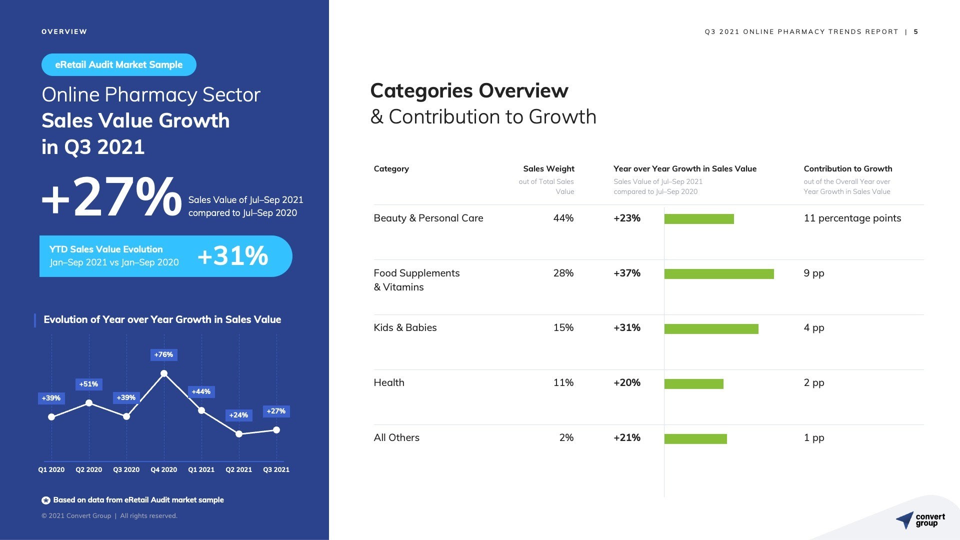 Τον ρυθμό ανάπτυξης +27% στην αξία (€) των online αγορών κατέγραψε το κανάλι του Online Φαρμακείου στην Ελλάδα, το τρίτο τρίμηνο του 2021, συγκριτικά με το αντίστοιχο τρίμηνο του 2020. Σύμφωνα με την έκθεση που δημοσιεύει σήμερα η Convert Group, στις κατηγορίες που αυξήθηκαν σε αξία (€) online αγορών τους μήνες Ιούλιο, Αύγουστο και Σεπτέμβριο, αναδεικνύονται οι εξής: +37% σε συμπληρώματα διατροφής και βιταμίνες, +31% σε βρεφικά και παιδικά είδη, +23% σε προϊόντα ομορφιάς και προσωπικής φροντίδας και +20% σε προϊόντα υγείας (με τις φαρμακευτικές μάσκες να συγκαταλέγονται σε αυτήν την κατηγορία). [Πίνακας 1].