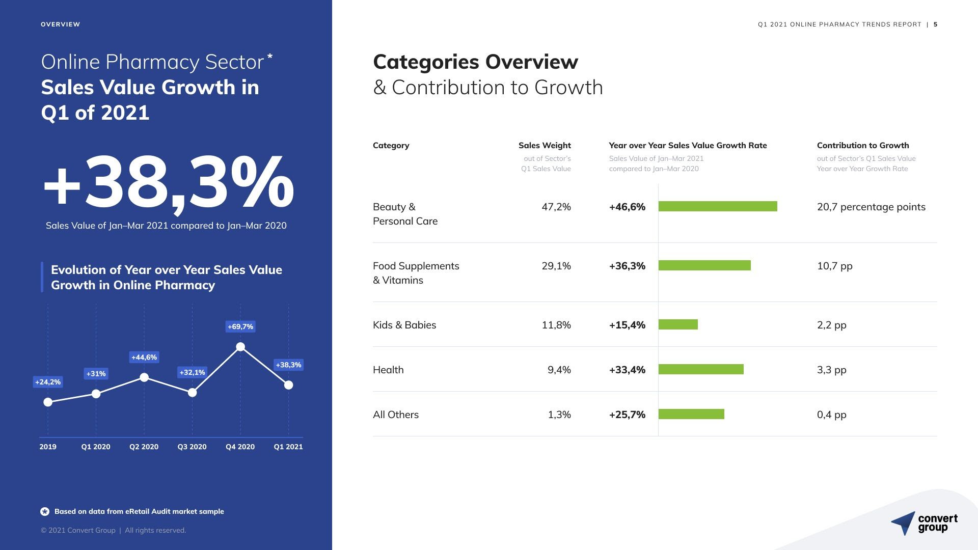 Tον σημαντικό ρυθμό ανάπτυξης +38,3% στην αξία (€) των online αγορών κατέγραψε το κανάλι του Online Φαρμακείου στην Ελλάδα, το πρώτο τρίμηνο του 2021, συγκριτικά με το αντίστοιχο τρίμηνο του 2020, σύμφωνα με την έκθεση που δημοσιεύει σήμερα η Convert Group. Στις κατηγορίες που αυξήθηκαν σε αξία (€) online αγορών τους μήνες Ιανουάριο, Φεβρουάριο και Μάρτιο, αναδεικνύονται οι εξής: +46,6% σε προϊόντα ομορφιάς και προσωπικής φροντίδας, +36,3% σε συμπληρώματα διατροφής και βιταμίνες, +33,4% σε προϊόντα υγείας (με τις φαρμακευτικές μάσκες να συγκαταλέγονται σε αυτήν την κατηγορία) και +15,4% σε βρεφικά και παιδικά είδη.
