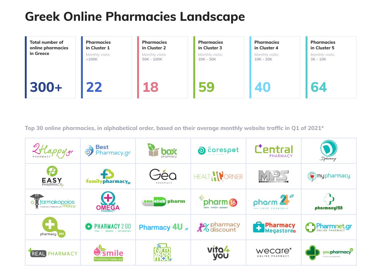 Συνολικά στη χώρα μας λειτουργούν 313 ηλεκτρονικά φαρμακεία, με τα 30 μεγαλύτερα να συγκεντρώνουν το 70% της επισκεψιμότητας των καταναλωτών [Πίνακας 2 σε αλφαβητική σειρά]. Διαφαίνεται ξεκάθαρα η τάση τα μεγάλα ηλ. φαρμακεία να ισχυροποιούνται συνεχώς σε σχέση με τα μικρότερα, λόγω ισχυρής αγοραστικής δύναμης, μεγάλων επενδύσεων σε marketing και υποδομές logistics αλλά και διεύρυνση της εμπορικής τους γκάμας.