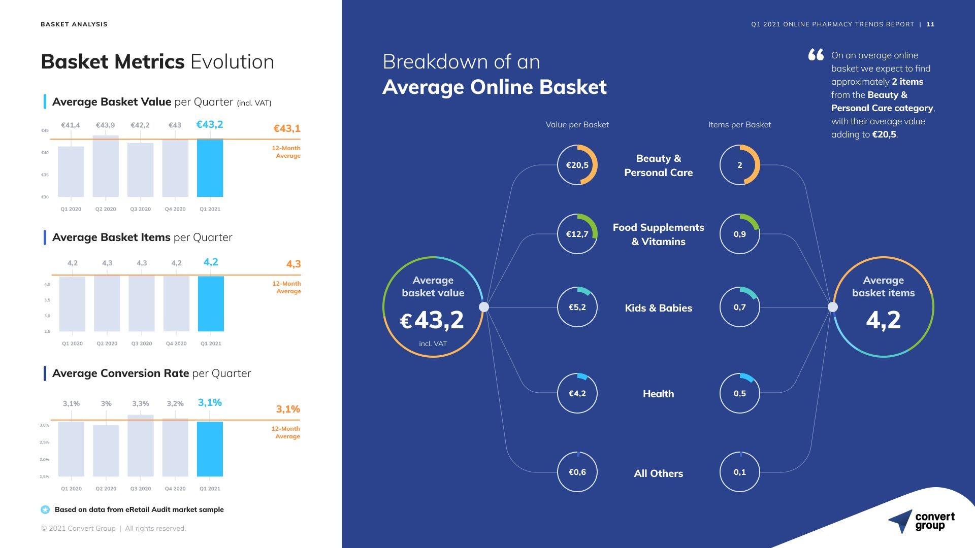 Στα ευρήματα της εταιρείας φάνηκε η σταδιακή εναλλαγή των νέων καταναλωτικών συνηθειών που επέφερε η πανδημία στο καταναλωτικό κοινό, με τις παλαιότερες συνήθειες του. Το μέσο αγοραστικό καλάθι στο πρώτο τρίμηνο του 2021 αυξήθηκε στα €43,2 με το ΦΠΑ από €41,4 που ήταν στο πρώτο τρίμηνο του 2020, ενώ η μέση ποσότητα προϊόντων παραμένει σταθερή στα 4,2 τεμάχια με τα 2 από αυτά να είναι προϊόντα Περιποίησης και Προσωπικής Φροντίδας. [Πίνακας 3]