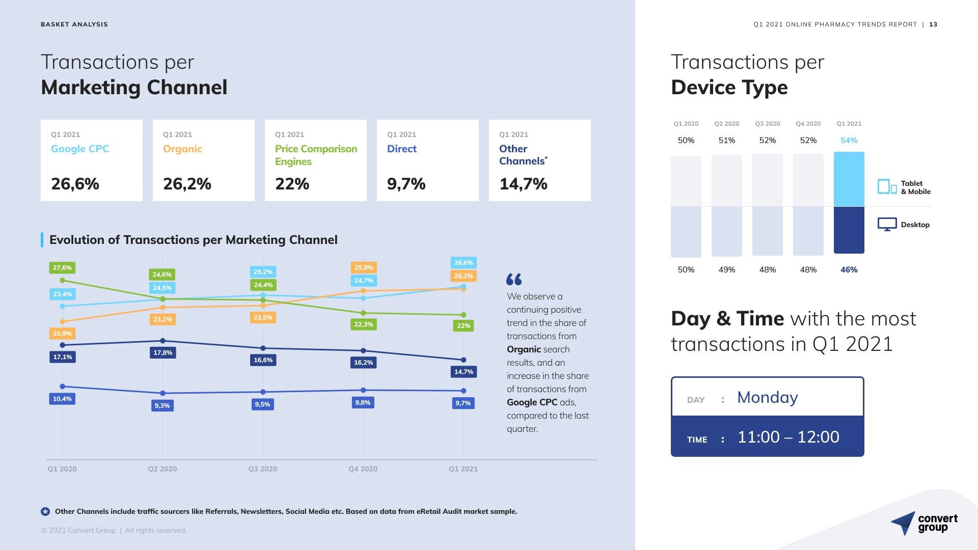 Αναφορικά με τα marketing κανάλια, τα ευρήματα έδειξαν πως είναι 5 φορές πιθανότερο μια αγορά να έχει προέλθει από περιήγηση του καταναλωτή σε μια μηχανή αναζήτησης (π.χ. Google) σε σχέση με την απευθείας επίσκεψή του στην ιστοσελίδα ενός φαρμακείου. Οι διαφημίσεις Google και τα Οργανικά Αποτελέσματα λοιπόν, πρωταγωνίστησαν το πρώτο τρίμηνο του 2021 φέρνοντας 26,6% και 26,2% των παραγγελιών αντίστοιχα, σημειώνοντας αύξηση 3,2 και 5,3 ποσοστιαίων μονάδων συγκριτικά με το πρώτο τρίμηνο του 2020. [Πίνακας 4]