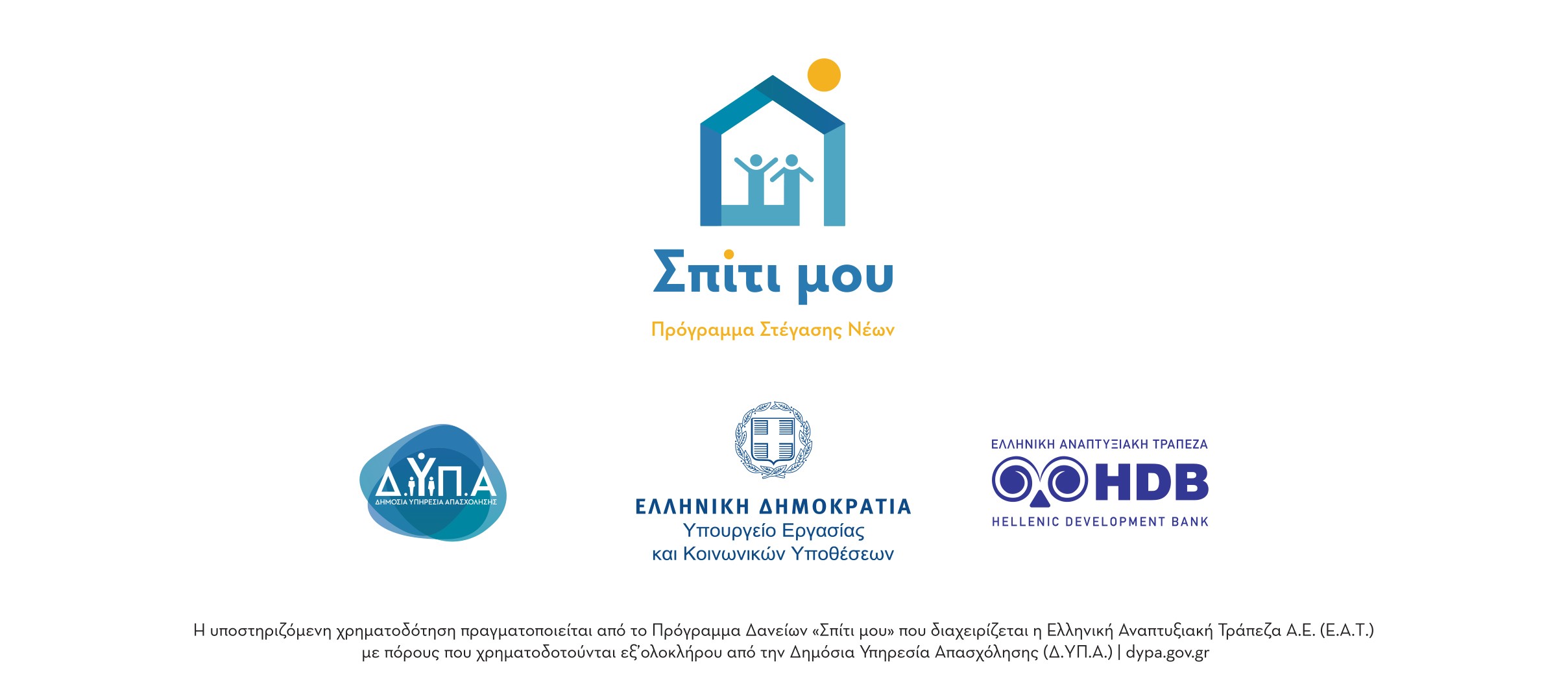 H υποστηριζόμενη χρηματοδότηση πραγματοποιείται από το Πρόγραμμα «Σπίτι μου» που διαχειρίζεται η Ελληνική Αναπτυξιακή Τράπεζα Α.Ε. (ΕΑΤ) με πόρους που χρηματοδοτούνται εξ ολοκλήρου από τη Δημόσια Υπηρεσία Απασχόλησης (ΔΥΠΑ) | dypa.gov.gr.