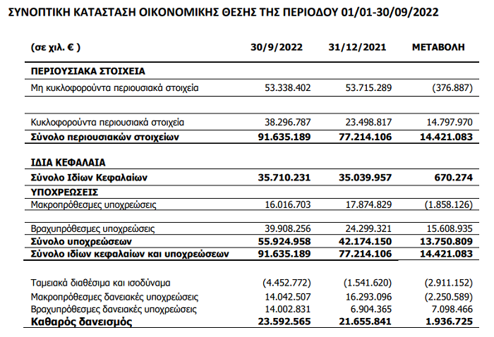 Κατά το γ΄ τρίμηνο της χρήσης 2022 δεν έλαβαν χώρα σημαντικές μεταβολές στην κεφαλαιακή διάρθρωση, στη δανειακή θέση, καθώς και στα λοιπά μεγέθη της κατάστασης χρηματοοικονομικής θέσης του Ομίλου.