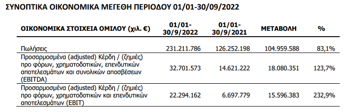 – Τα προσαρμοσμένα (adjusted) κέρδη προ φόρων, χρηματοδοτικών, επενδυτικών αποτελεσμάτων και αποσβέσεων (EBITDA) του Ομίλου, ανήλθαν στα € 32,7 εκατ. έναντι € 14,6 εκατ. το αντίστοιχο εννεάμηνο του 2021, αυξημένα κατά € 18,1 εκατ. ή +123,7% ,