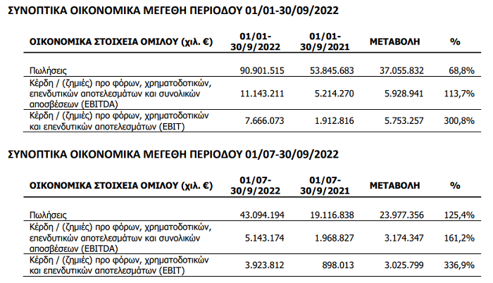 Οι πωλήσεις του Ομίλου το εννεάμηνο του 2022 παρουσίασαν αύξηση κατά € 37,1 εκατ., ή +68,8% σε σύγκριση με το αντίστοιχο εννεάμηνο του 2021. Η σημαντική αύξηση του κύκλου εργασιών προέρχεται κυρίως από: