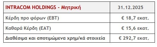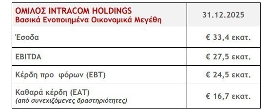 Η INTRACOM HOLDINGS (Euronext Athens: INTKA) ανακοινώνει τα οικονομικά αποτελέσματα του έτους 2025, σύμφωνα με τα διεθνή λογιστικά πρότυπα: