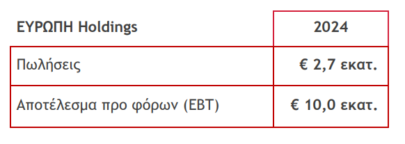 Η ΕΥΡΩΠΗ HOLDINGS (πρώην ΚΛΜ), μέσα στο 2024 ολοκλήρωσε έναν ευρύ εταιρικό μετασχηματισμό, που κατέληξε στην συγχώνευση, μέσω απορρόφησης, με την INTRACOM PROPERTIES. Η νέα εταιρία μετονομάστηκε σε ΕΥΡΩΠΗ HOLDINGS και διαθέτει πλέον χαρτοφυλάκιο επενδυτικών ακινήτων €134,0 εκατ. Η εταιρία με ίδια κεφάλαια €120,3 εκατ., και ενεργητικό €165,1 εκατ., αποτελεί ισχυρό επενδυτικό όχημα, που μέσω της εξαγοράς της ΕΥΡΩΠΗ Ασφαλιστικής, θα υλοποιήσει την είσοδο του Ομίλου στην ασφαλιστική αγορά.