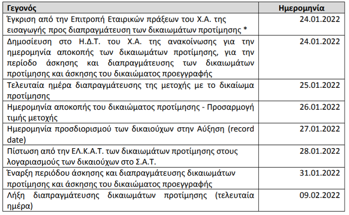 Το αναμενόμενο χρονοδιάγραμμα της ολοκλήρωσης της Αύξησης και της εισαγωγής προς διαπραγμάτευση των Νέων Μετοχών είναι το εξής: